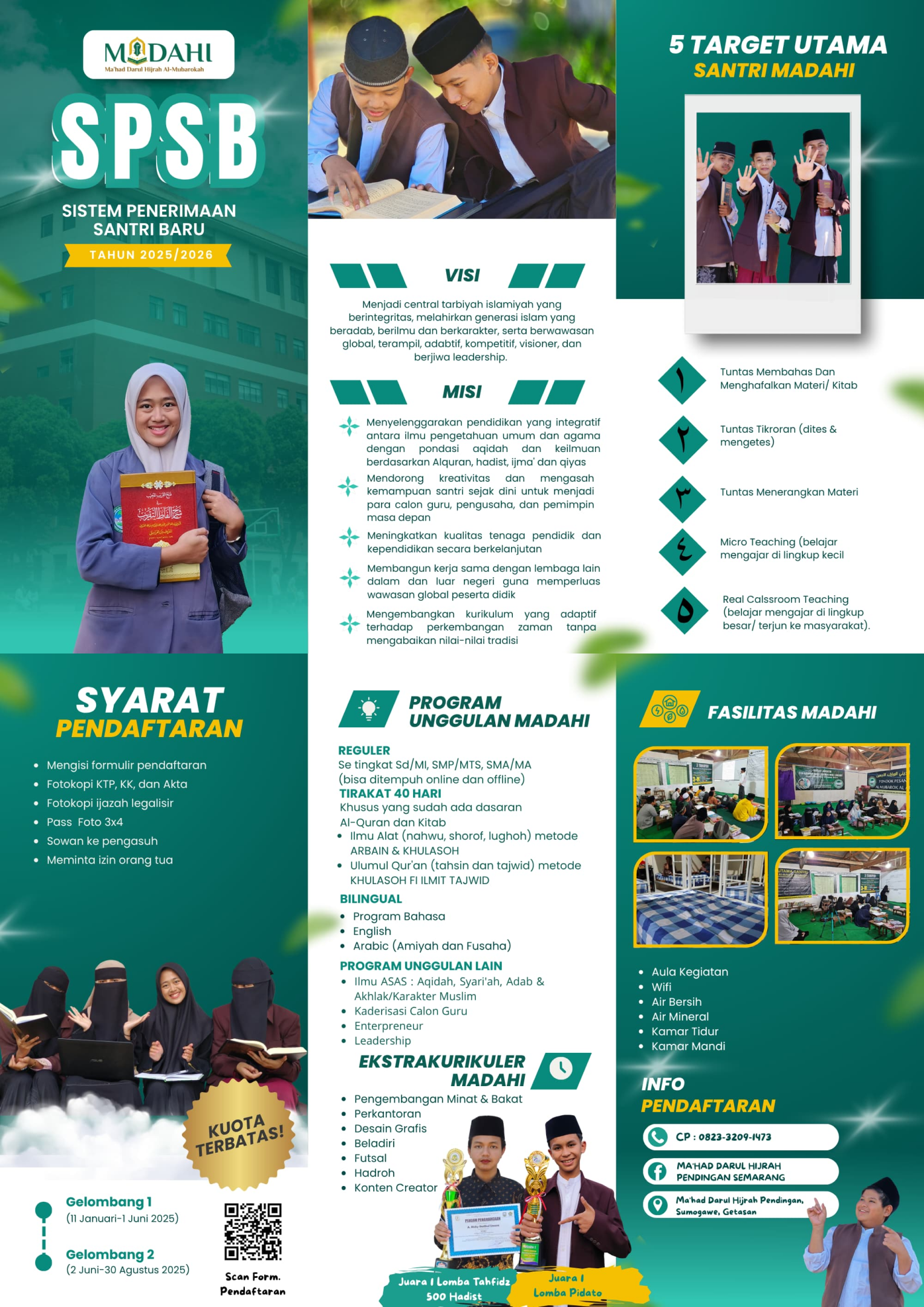 Melalui situs web ini, kami berharap seluruh stakeholders pesantren, orang tua santri, dan calon santri dapat mengenal atau mengetahui segala informasi tentang secara lebih luas, baik informasi mengenai sekolah, informasi terbaru, maupun berbagai kegiatan pembelajaran di pesantren dengan cepat, efisien, dan online selama 24 jam.